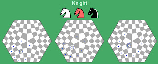 اسب، مانند شطرنج استاندارد، یک میدان را در یک جهت متعامد، سپس دو میدان را در جهت دیگر، یا برعکس حرکت میدهد: دو میدان در یک جهت و یکی در جهت دیگر. در یک صفحه شطرنج معمولی، این دو توالی اثر یکسانی دارند، اما در این صفحه در اطراف مرکز ممکن است متفاوت باشند و این ممکن است بیش از هشت احتمال برای اسب ایجاد کند.