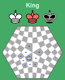 شاه به صورت قائم یا مورب به زمینهای مجاور حرکت میکند، با این تفاوت که نمیتواند از مرکز تخته مستقیماً به زمین دیگر با رنگ متضاد حرکت کند. بنابراین میتواند در همان جهت ملکه حرکت کند، اما فقط به اندازه یک فاصله زمین. قلعهگیری همانند شطرنج استاندارد عمل میکند.
